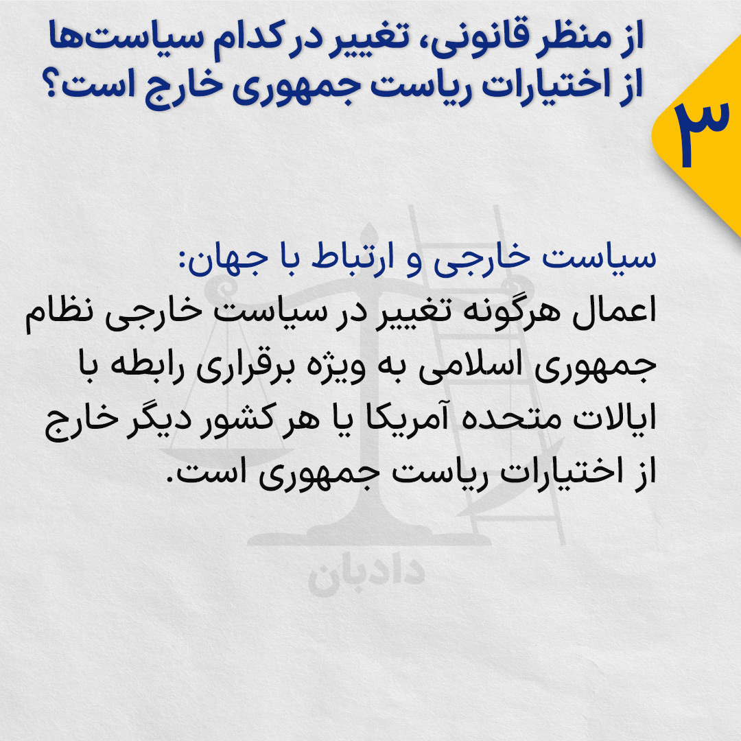 اعمال هرگونه تغییر در سیاست خارجی نظام جمهوری اسلامی به ویژه برقراری رابطه با ایالات متحده آمریکا یا هر کشور دیگر خارج از اختیارات ریاست جمهوری است.