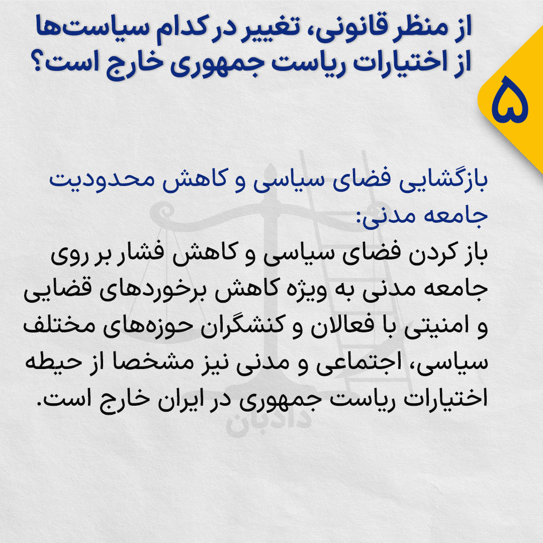 باز کردن فضای سیاسی و کاهش فشار بر روی جامعه مدنی به ویژه کاهش برخوردهای قضایی و امنیتی با فعالان و کنشگران حوزههای مختلف سیاسی، اجتماعی و مدنی نیز مشخصا از حیطه اختیارات ریاست جمهوری در ایران خارج است.