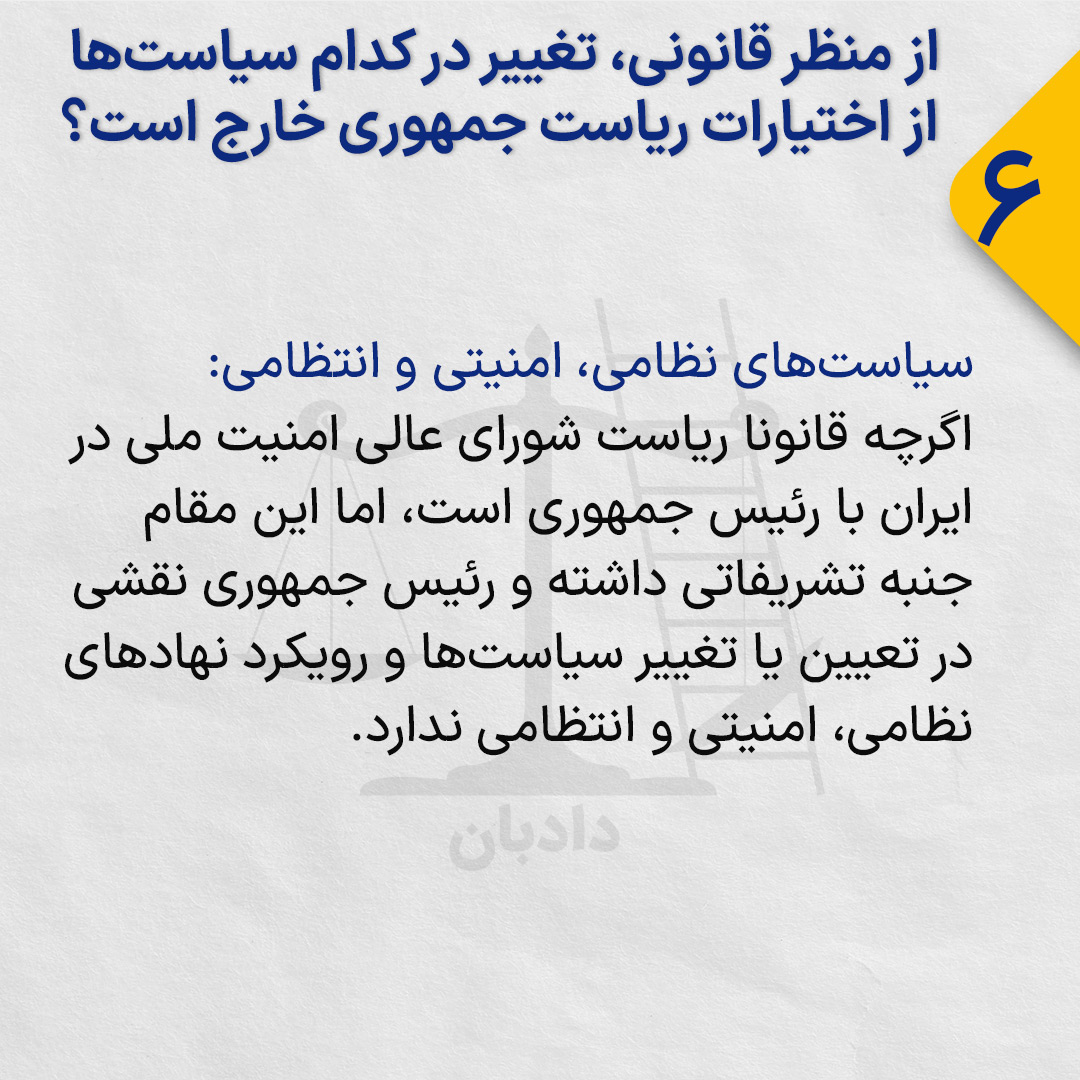 اگرچه قانونا ریاست شورای عالی امنیت ملی در ایران با رئیس جمهوری است، اما این مقام جنبه تشریفاتی داشته و رئیس جمهوری نقشی در تعیین یا تغییر سیاستها و رویکرد نهادهای نظامی، امنیتی و انتظامی ندارد.