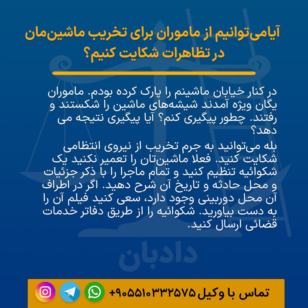 بله میتوانید به جرم تخریب از نیروی انتظامی شکایت کنید. فعلا ماشینتان را تعمیر نکنید یک شکوائیه تنظیم کنید و تمام ماجرا را با ذکر جزئیات و محل حادثه و تاریخ آن شرح دهید. اگر در اطراف آن محل دوربینی وجود دارد، سعی کنید فیلم آن را به دست بیاورید. شکوائیه را از طریق دفاتر خدمات قضائی ارسال کنید.