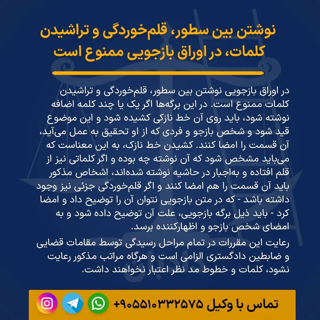 در اوراق بازجویی نوشتن بین سطور، قلمخوردگی و تراشیدن کلمات ممنوع است. در این برگهها اگر یک یا چند کلمه اضافه نوشته شود، باید روی آن خط نازکی کشیده شود و این موضوع قید شود و شخص بازجو و فردی که از او تحقیق به عمل میآید، آن قسمت را امضا کنند. کشیدن خط نازک، به این معناست که میباید مشخص شود که آن نوشته چه بوده و اگر کلماتی نیز از قلم افتاده و بهاجبار در حاشیه نوشته شدهاند، اشخاص مذکور باید آن قسمت را هم امضا کنند و اگر قلمخوردگی جزئی نیز وجود داشته باشد – که در متن بازجویی نتوان آن را توضیح داد و امضا کرد – باید ذیل برگه بازجویی، علت آن توضیح داده شود و به امضای شخص بازجو و اظهارکننده برسد. رعایت این مقررات در تمام مراحل رسیدگی توسط مقامات قضایی و ضابطین دادگستری الزامی است و هرگاه مراتب مذکور رعایت نشود، کلمات و خطوط مد نظر اعتبار نخواهند داشت.