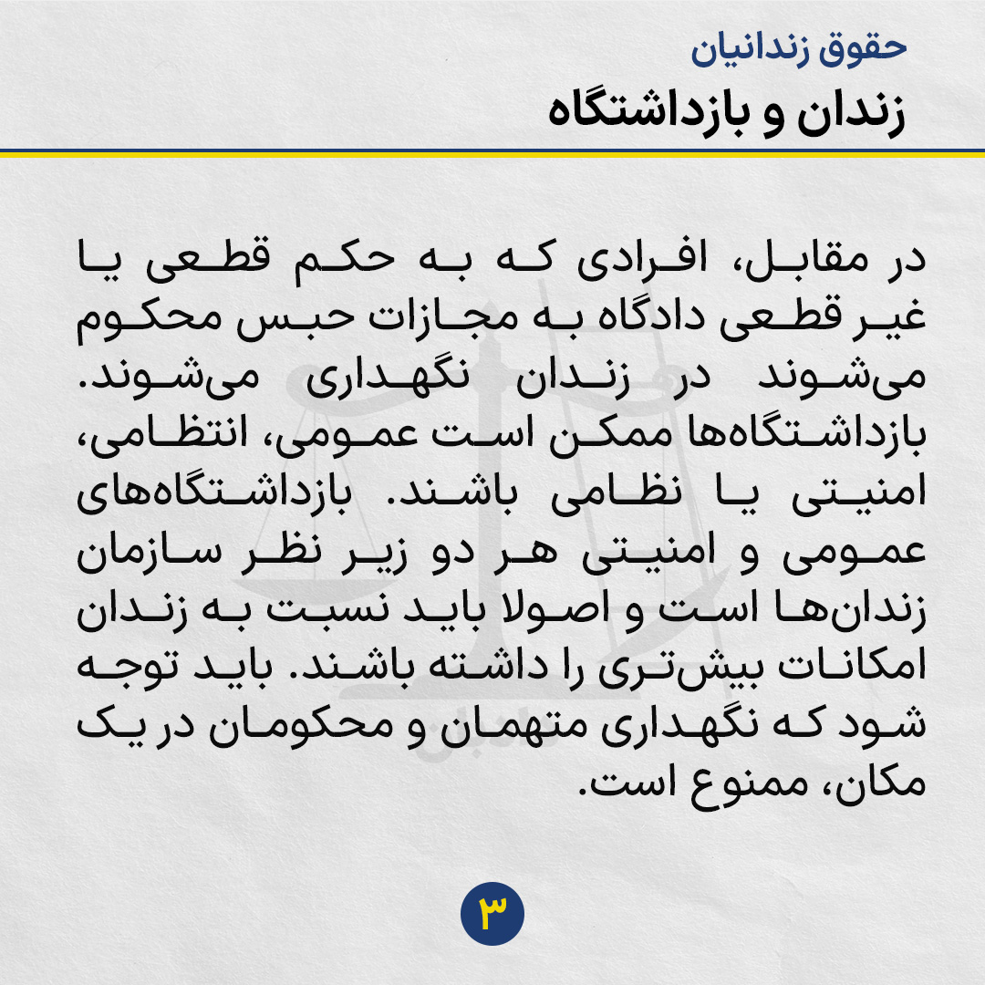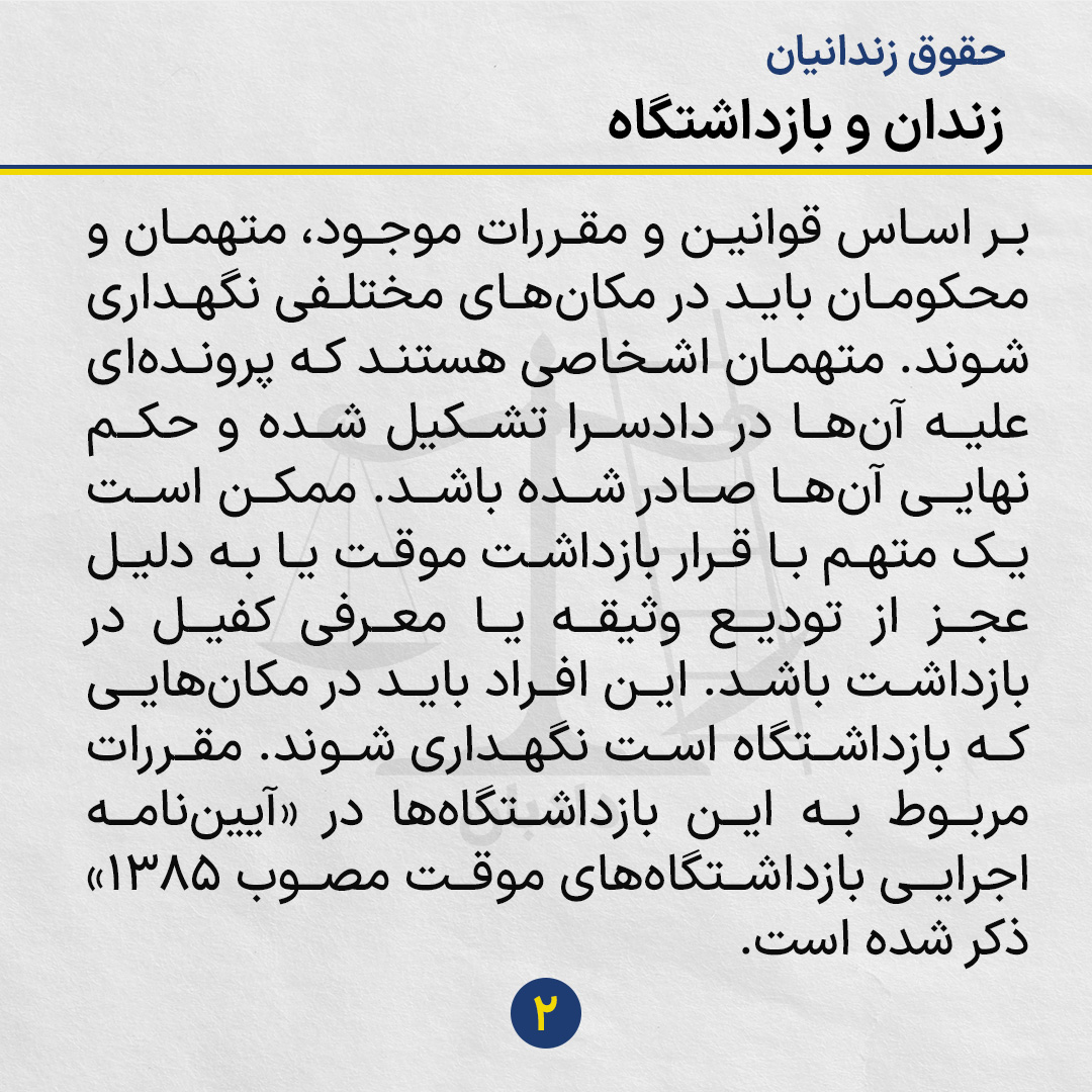 بر اساس قوانین و مقررات موجود، متهمان و محکومان باید در مکانهای مختلفی نگهداری شوند. متهمان اشخاصی هستند که پروندهای علیه آنها در دادسرا تشکیل شده و حکم نهایی آنها صادر شده باشد. ممکن است یک متهم با قرار بازداشت موقت یا به دلیل عجز از تودیع وثیقه یا معرفی کفیل در بازداشت باشد. این افراد باید در مکانهایی که بازداشتگاه است نگهداری شوند. مقررات مربوط به این بازداشتگاهها در «آییننامه اجرایی بازداشتگاههای موقت مصوب ۱۳۸۵» ذکر شده است.