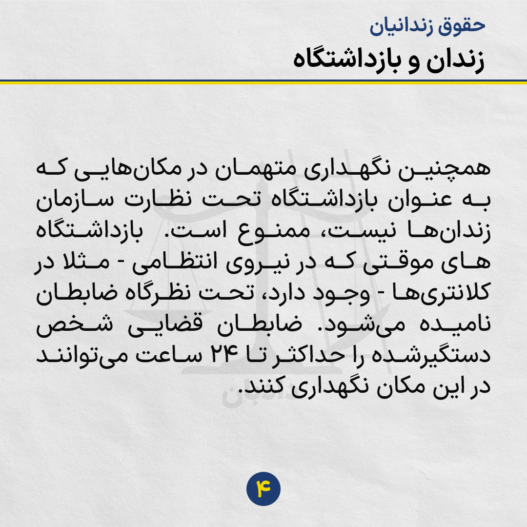 همچنین نگهداری متهمان در مکانهایی که به عنوان بازداشتگاه تحت نظارت سازمان زندانها نیست، ممنوع است. بازداشتگاههای موقتی که در نیروی انتظامی – مثلا در کلانتریها – وجود دارد، تحت نظرگاه ضابطان نامیده میشود. ضابطان قضایی شخص دستگیرشده را حداکثر تا ۲۴ ساعت میتوانند در این مکان نگهداری کنند.