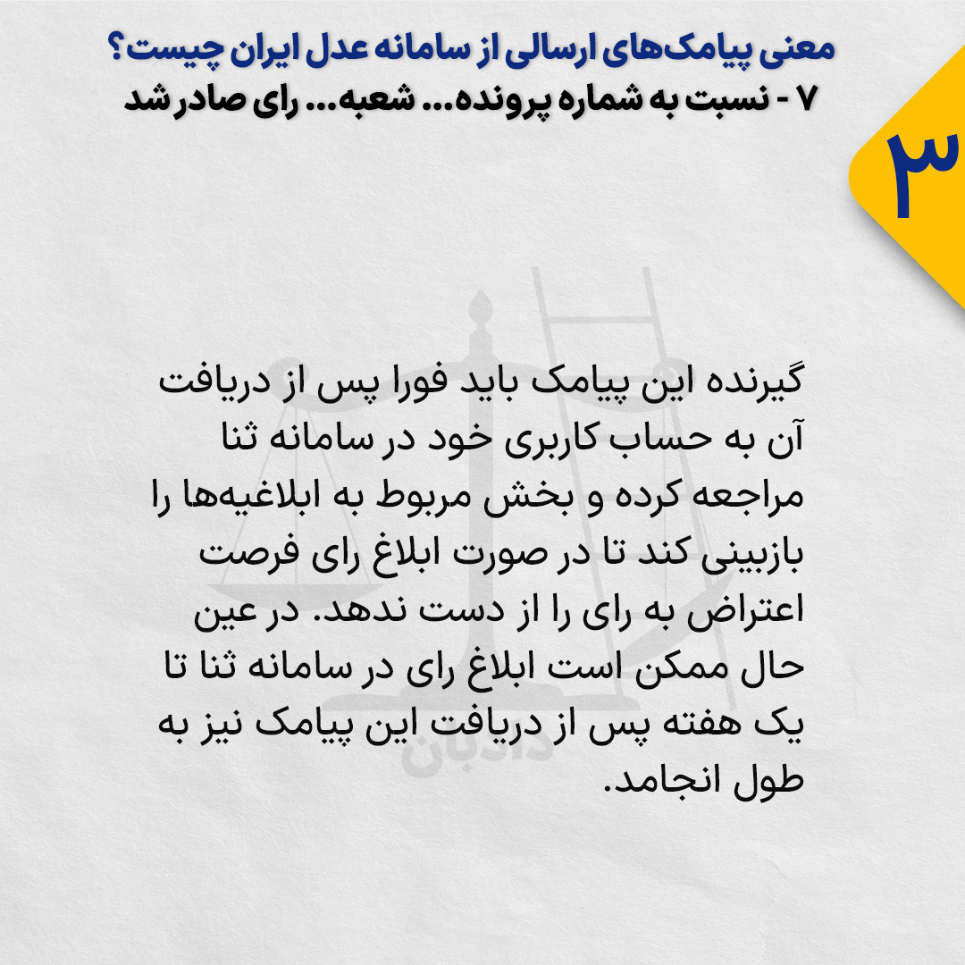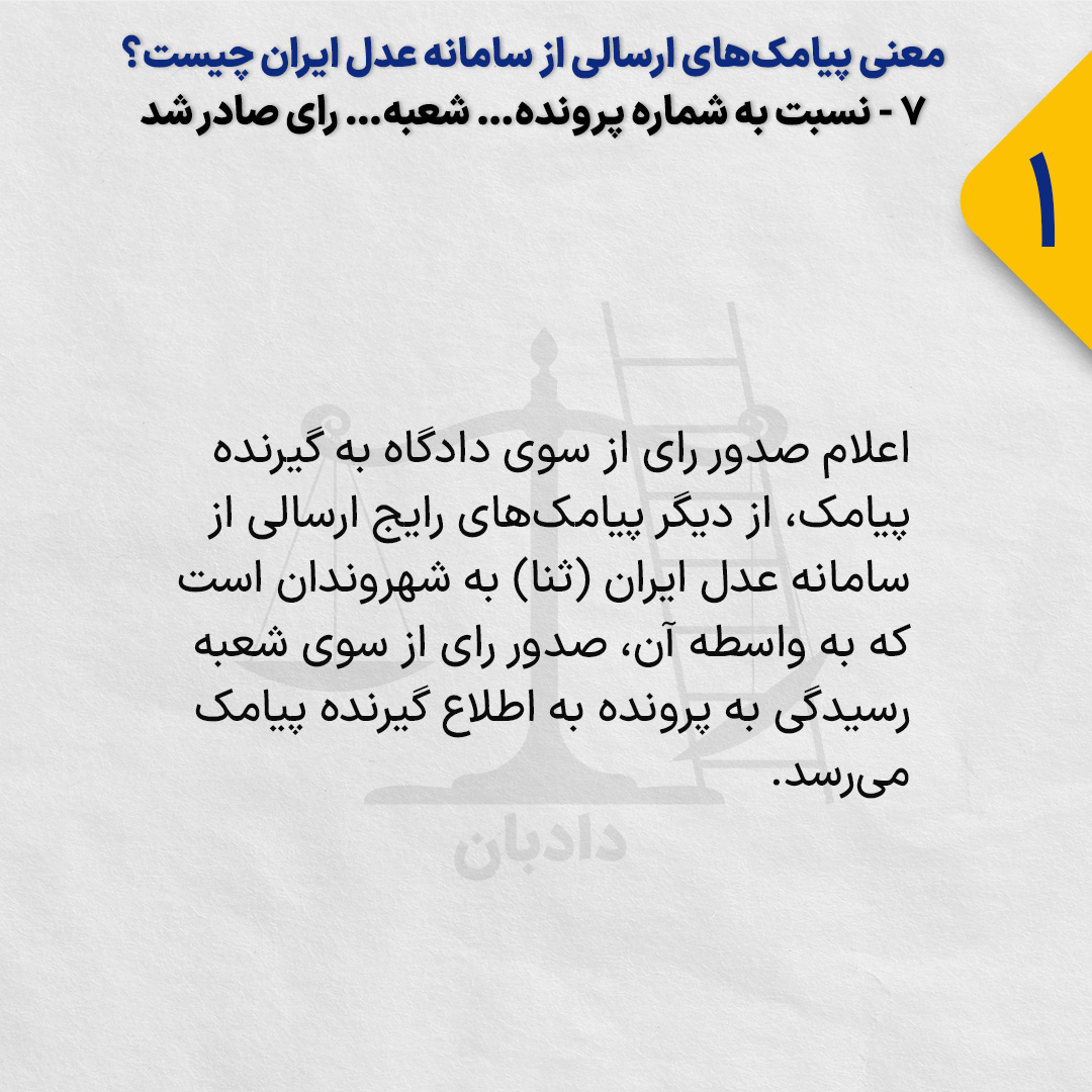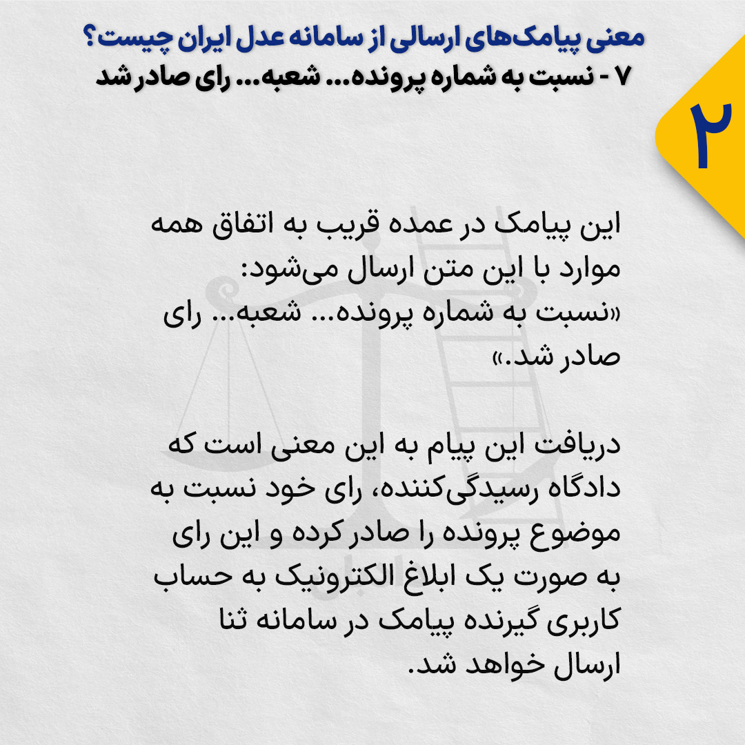 دریافت این پیام به این معنی است که دادگاه رسیدگی‌کننده، رای خود نسبت به موضوع پرونده را صادر کرده و این رای به صورت یک ایلاغ الکترونیک به حساب کاربری گیرنده پیامک در سامانه ثنا ارسال خواهد شد.