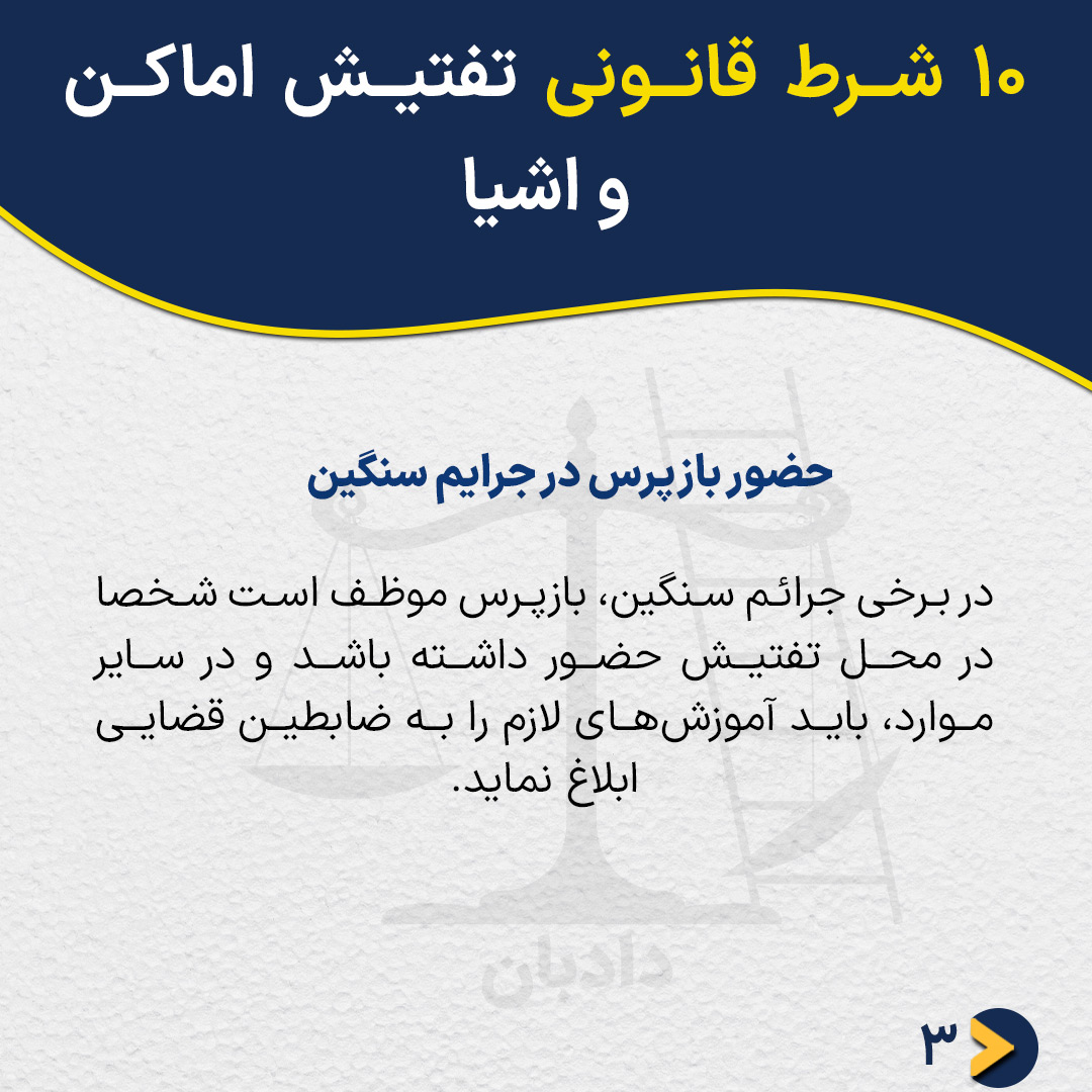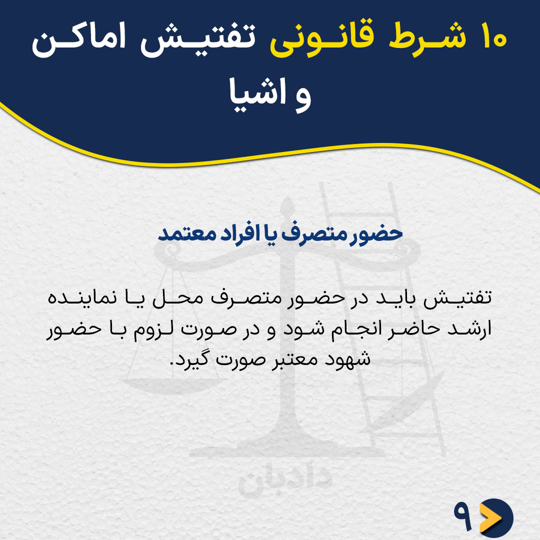 تفتیش باید در حضور متصرف محل یا نماینده ارشد حاضر انجام شود و در صورت لزوم با حضور شهود معتبر صورت گیرد.