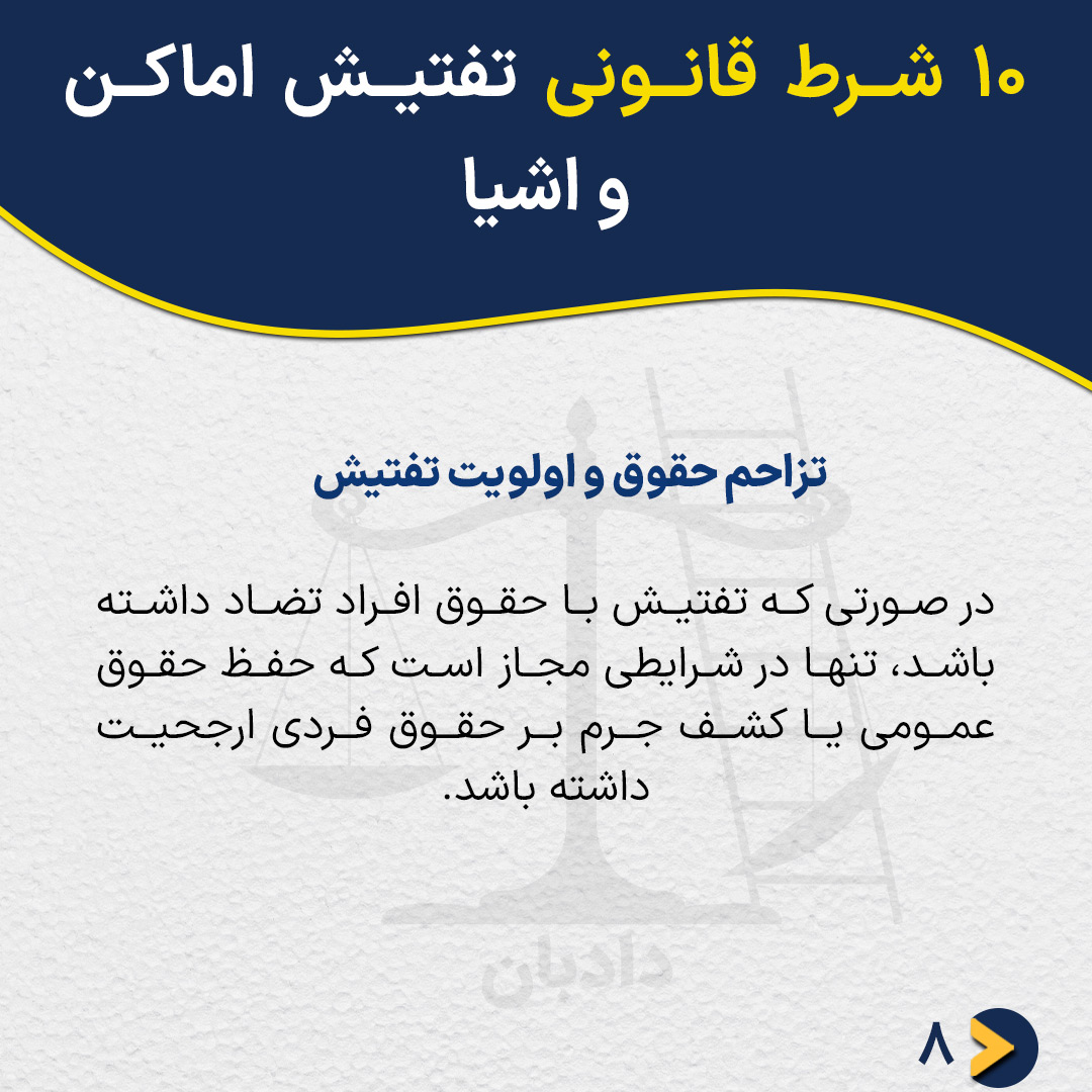 در صورتی که تفتیش با حقوق افراد تضاد داشته باشد، تنها در شرایطی مجاز است که حفظ حقوق عمومی یا کشف جرم بر حقوق فردی ارجحیت داشته باشد.