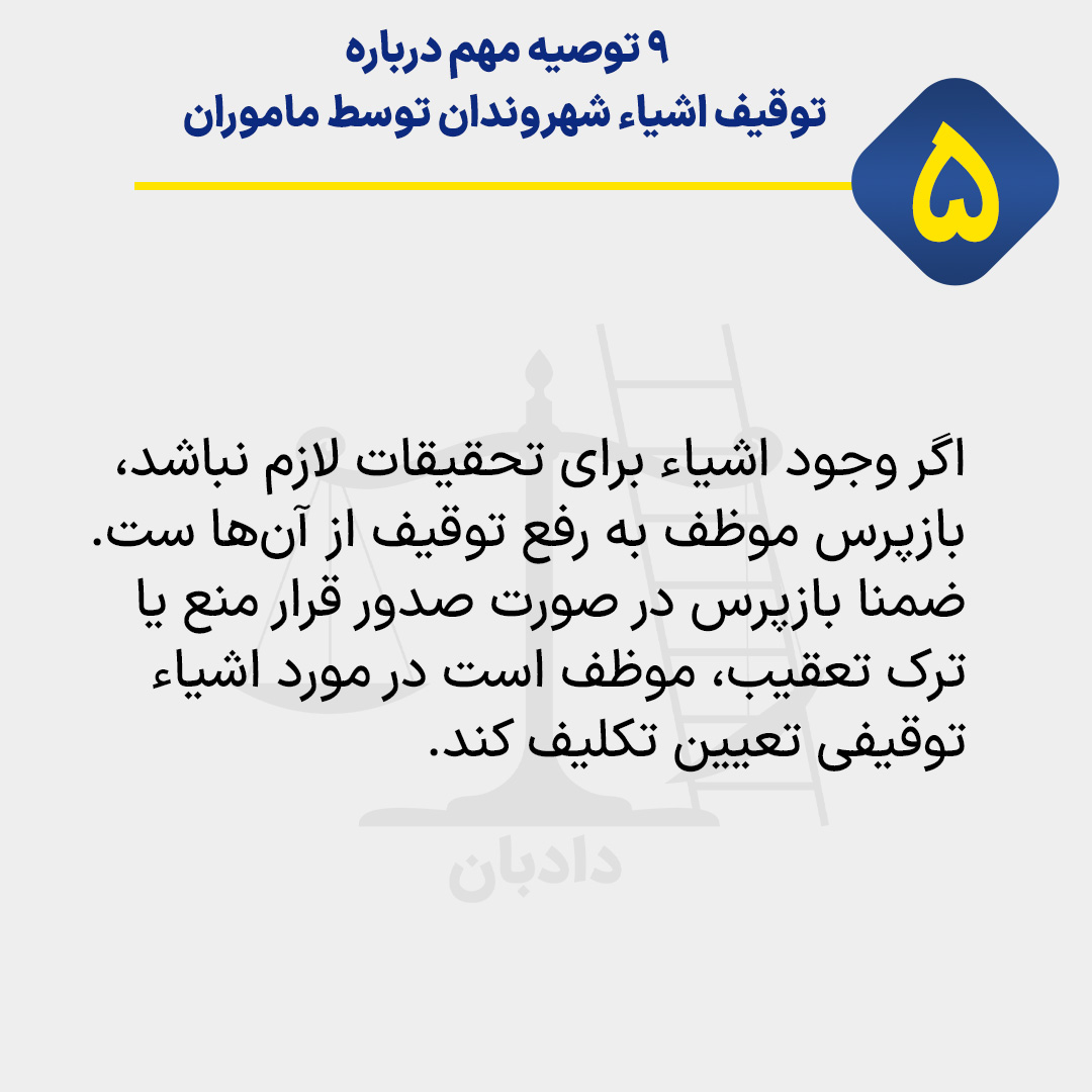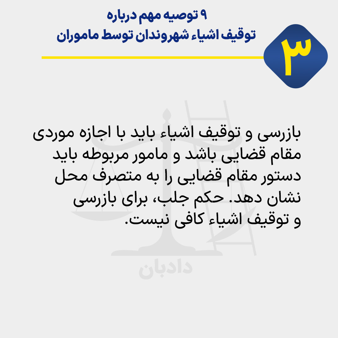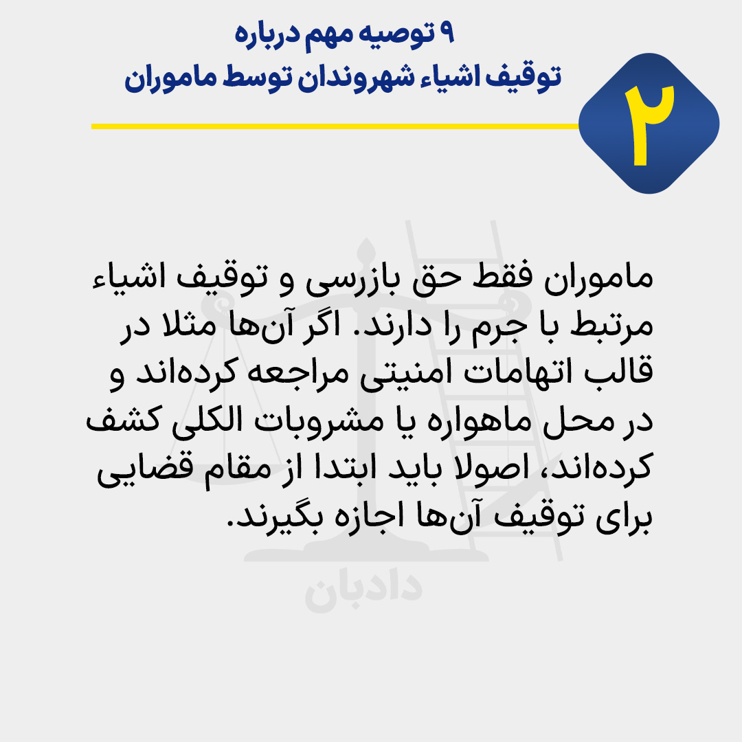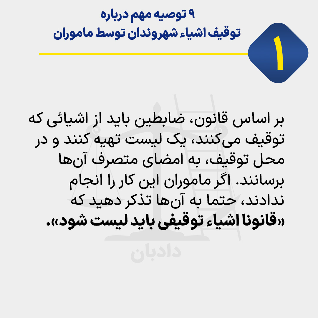 – بر اساس قانون، ضابطین باید از اشیائی که توقیف میکنند، یک لیست تهیه کنند و در محل توقیف، به امضای متصرف آنها برسانند. اگر ماموران این کار را انجام ندادند، حتما به آنها تذکر دهید که «قانونا اشیاء توقیفی باید لیست شود».