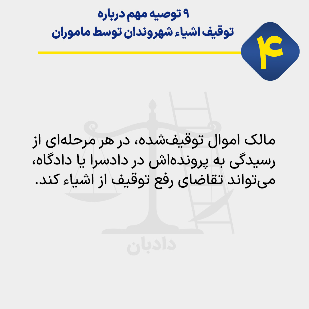 – مالک اموال توقیفشده، در هر مرحلهای از رسیدگی به پروندهاش در دادسرا یا دادگاه، میتواند تقاضای رفع توقیف از اشیاء کند.