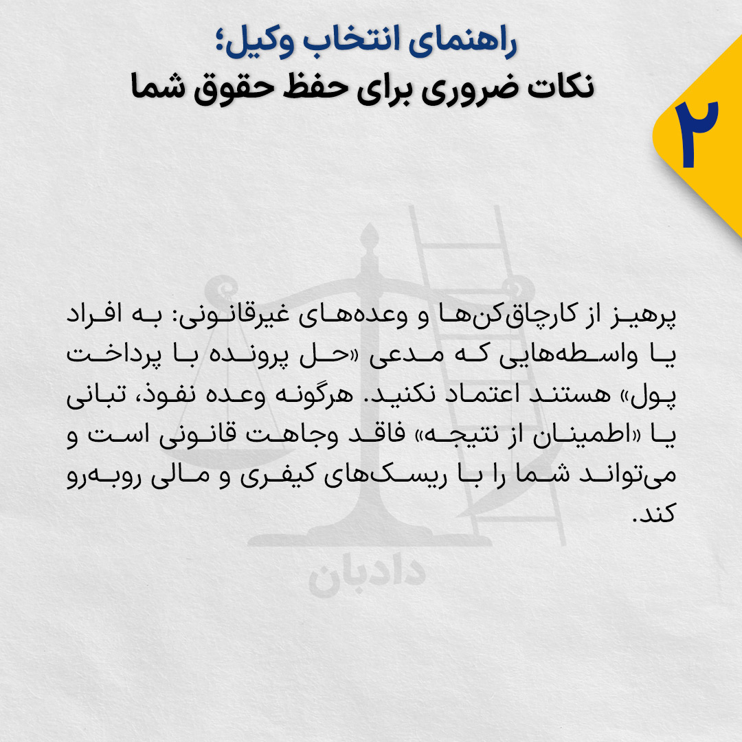 پرهیز از کارچاقکنها و وعدههای غیرقانونی: به افراد یا واسطههایی که مدعی «حل پرونده با پرداخت پول» هستند اعتماد نکنید. هرگونه وعده نفوذ، تبانی یا «اطمینان از نتیجه» فاقد وجاهت قانونی است و میتواند شما را با ریسکهای کیفری و مالی روبهرو کند.