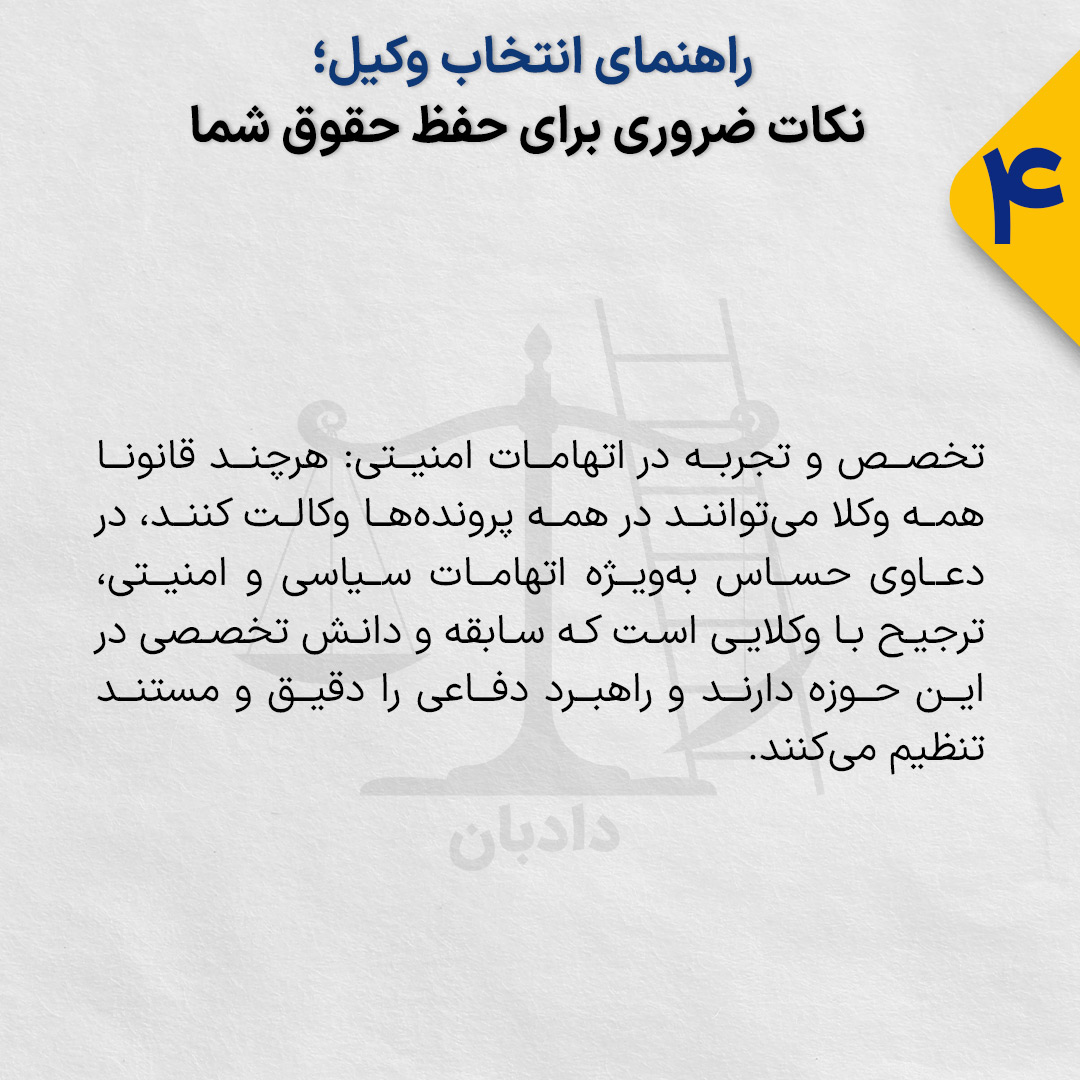 تخصص و تجربه در اتهامات امنیتی: هرچند قانونا همه وکلا میتوانند در همه پروندهها وکالت کنند، در دعاوی حساس بهویژه اتهامات سیاسی و امنیتی، ترجیح با وکلایی است که سابقه و دانش تخصصی در این حوزه دارند و راهبرد دفاعی را دقیق و مستند تنظیم میکنند.