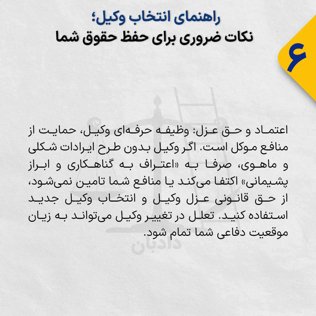 اعتماد و حق عزل: وظیفه حرفهای وکیل، حمایت از منافع موکل است. اگر وکیل بدون طرح ایرادات شکلی و ماهوی، صرفا به «اعتراف به گناهکاری و ابراز پشیمانی» اکتفا میکند یا منافع شما تامین نمیشود، از حق قانونی عزل وکیل و انتخاب وکیل جدید استفاده کنید. تعلل در تغییر وکیل میتواند به زیان موقعیت دفاعی شما تمام شود.