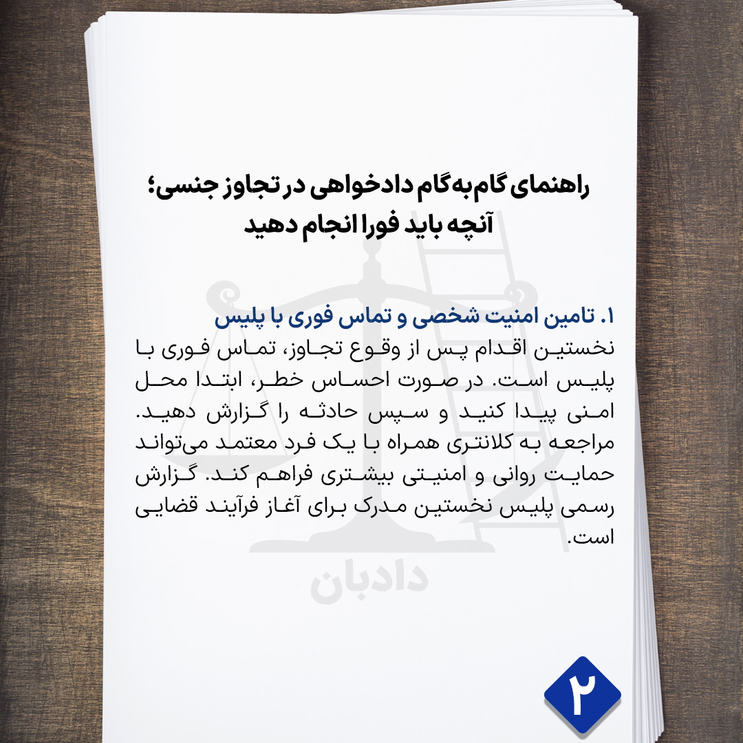 نخستین اقدام پس از وقوع تجاوز، تماس فوری با پلیس است. در صورت احساس خطر، ابتدا محل امنی پیدا کنید و سپس حادثه را گزارش دهید. مراجعه به کلانتری همراه با یک فرد معتمد میتواند حمایت روانی و امنیتی بیشتری فراهم کند. گزارش رسمی پلیس نخستین مدرک برای آغاز فرآیند قضایی است.
