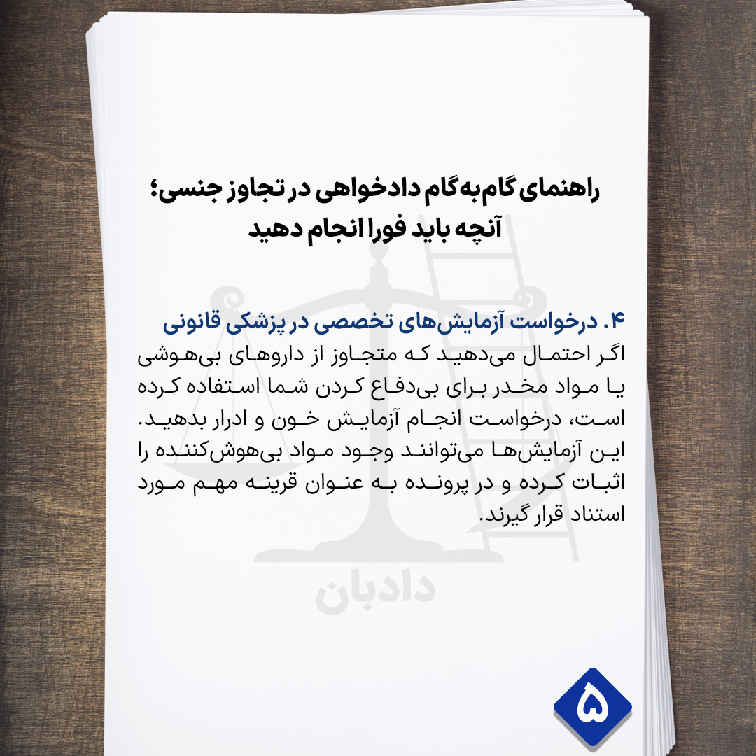اگر احتمال میدهید که متجاوز از داروهای بیهوشی یا مواد مخدر برای بیدفاع کردن شما استفاده کرده است، درخواست انجام آزمایش خون و ادرار بدهید. این آزمایشها میتوانند وجود مواد بیهوشکننده را اثبات کرده و در پرونده به عنوان قرینه مهم مورد استناد قرار گیرند.