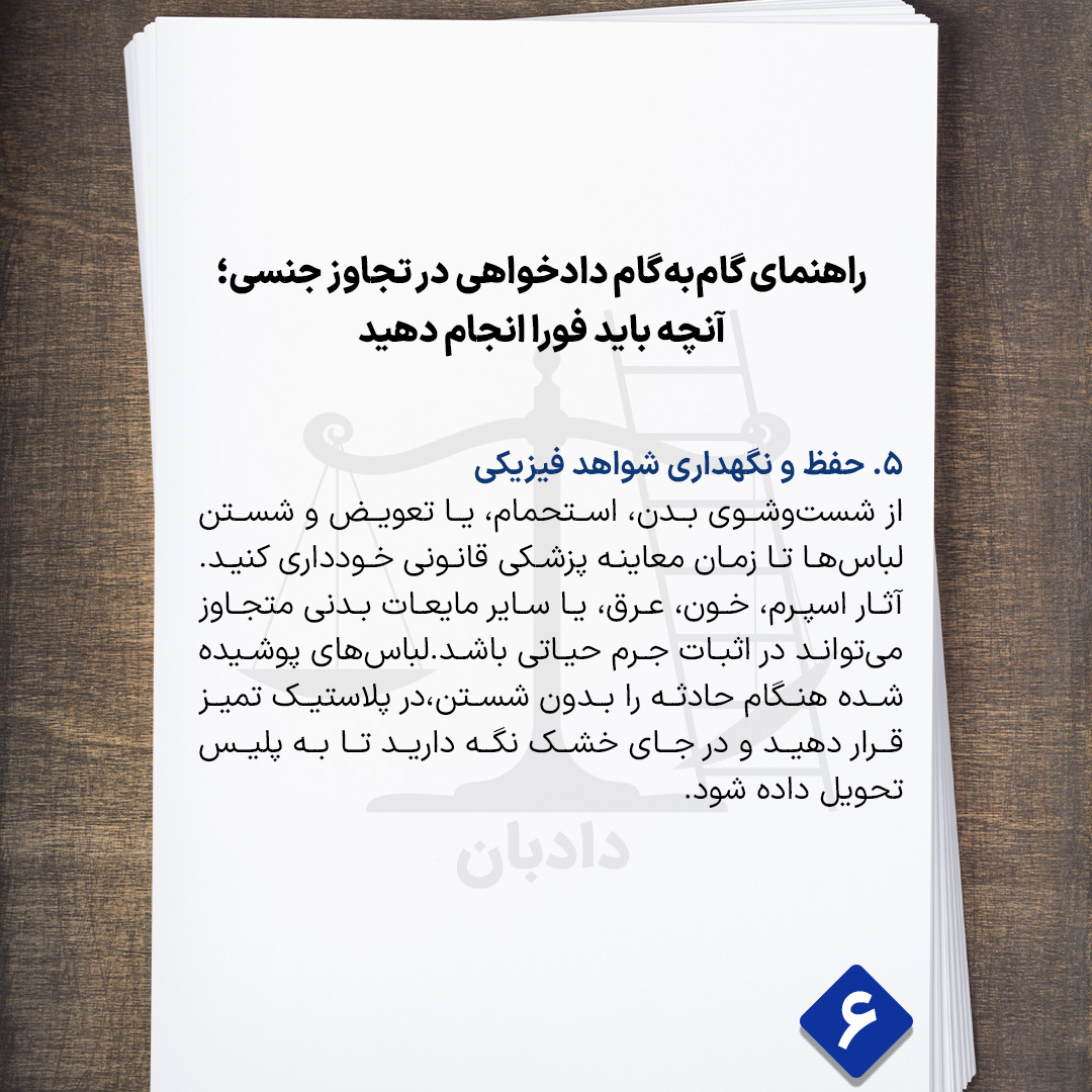 از شستوشوی بدن، استحمام، یا تعویض و شستن لباسها تا زمان معاینه پزشکی قانونی خودداری کنید. آثار اسپرم، خون، عرق، یا سایر مایعات بدنی متجاوز میتواند در اثبات جرم حیاتی باشد. لباسهای پوشیدهشده هنگام حادثه را بدون شستن، در پلاستیک تمیز قرار دهید و در جای خشک نگه دارید تا به پلیس تحویل داده شود.