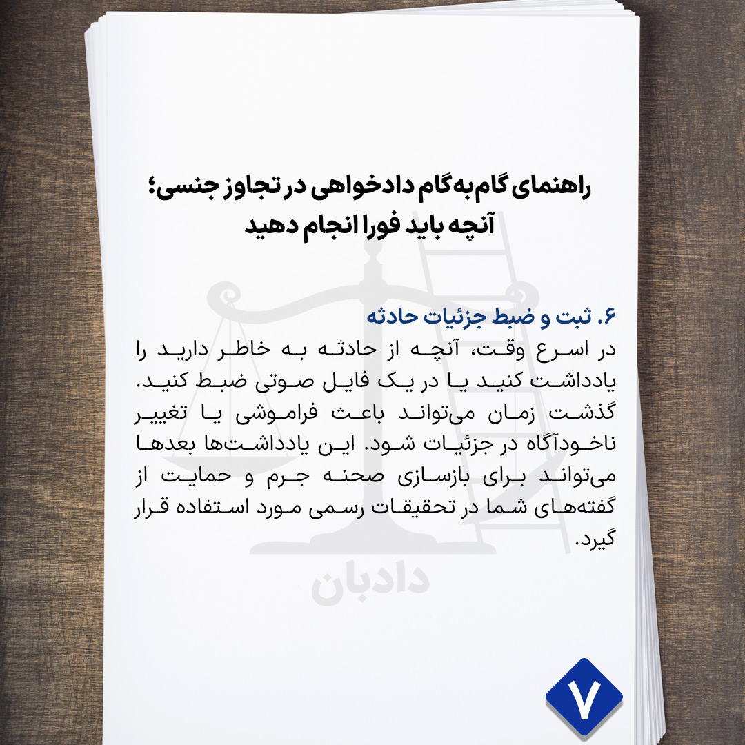 در اسرع وقت، آنچه از حادثه به خاطر دارید را یادداشت کنید یا در یک فایل صوتی ضبط کنید. گذشت زمان میتواند باعث فراموشی یا تغییر ناخودآگاه در جزئیات شود. این یادداشتها بعدها میتواند برای بازسازی صحنه جرم و حمایت از گفتههای شما در تحقیقات رسمی مورد استفاده قرار گیرد.