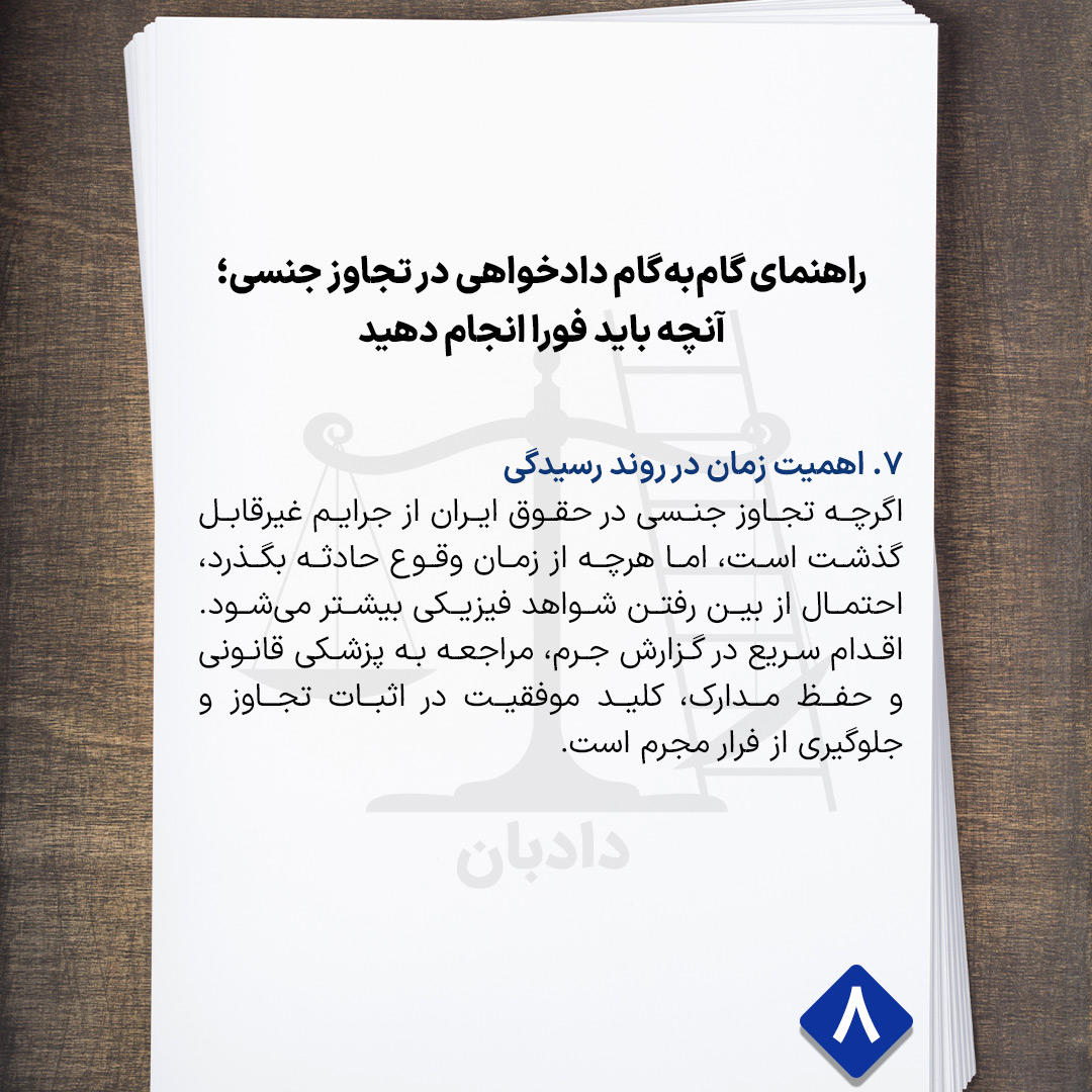اگرچه تجاوز جنسی در حقوق ایران از جرایم غیرقابل گذشت است، اما هرچه از زمان وقوع حادثه بگذرد، احتمال از بین رفتن شواهد فیزیکی بیشتر میشود. اقدام سریع در گزارش جرم، مراجعه به پزشکی قانونی و حفظ مدارک، کلید موفقیت در اثبات تجاوز و جلوگیری از فرار مجرم است.