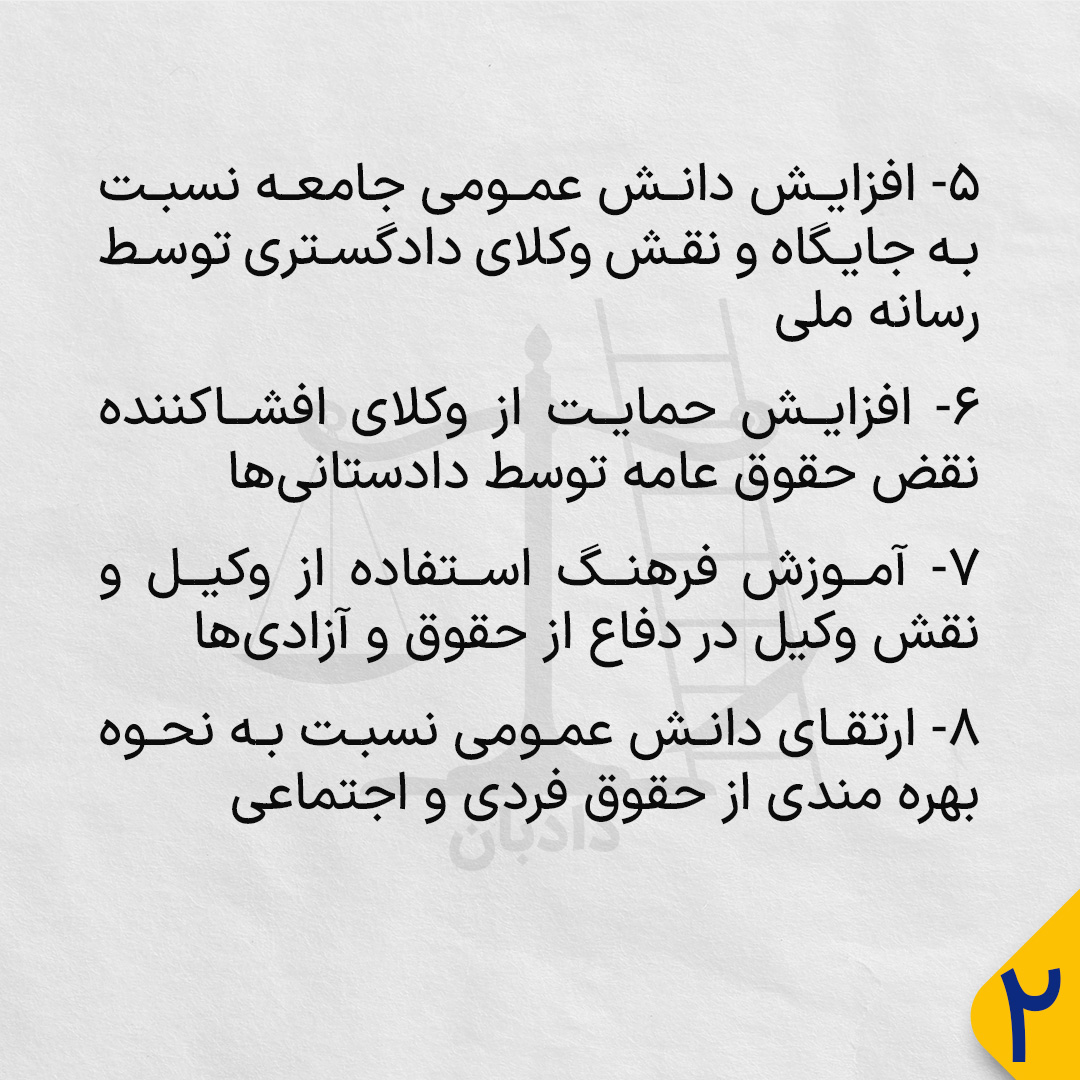 ۵- افزایش دانش عمومی جامعه نسبت به جایگاه و نقش وکلای دادگستری توسط رسانه ملی