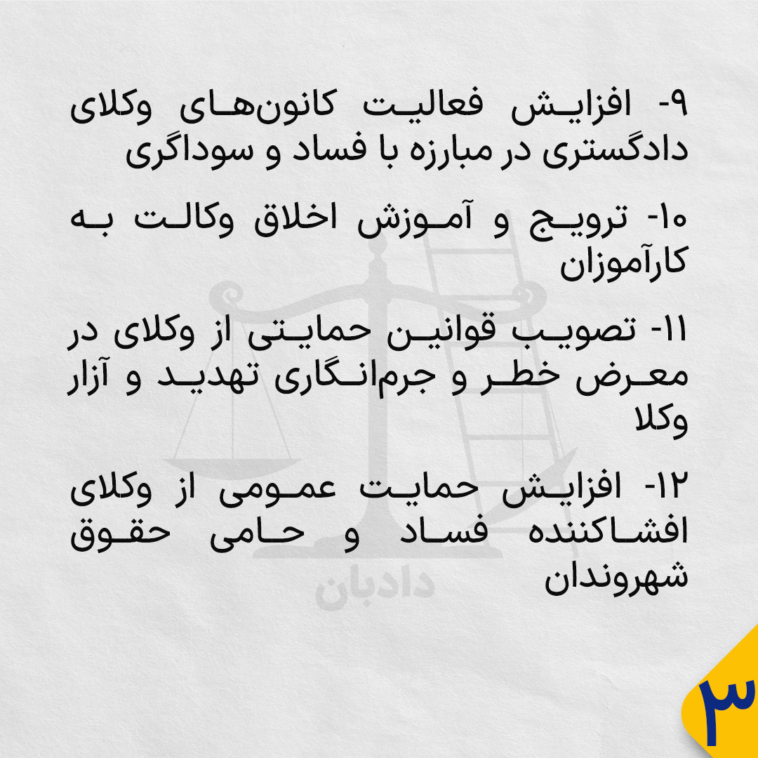 ۹- افزایش فعالیت کانونهای وکلای دادگستری در مبارزه با فساد و سوداگری