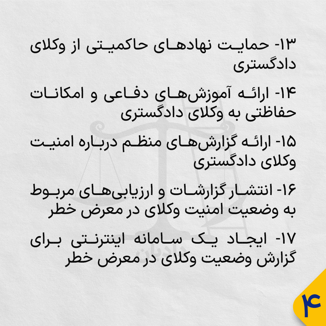 ۱۷- ایجاد یک سامانه اینترنتی برای گزارش وضعیت وکلای در معرض خطر