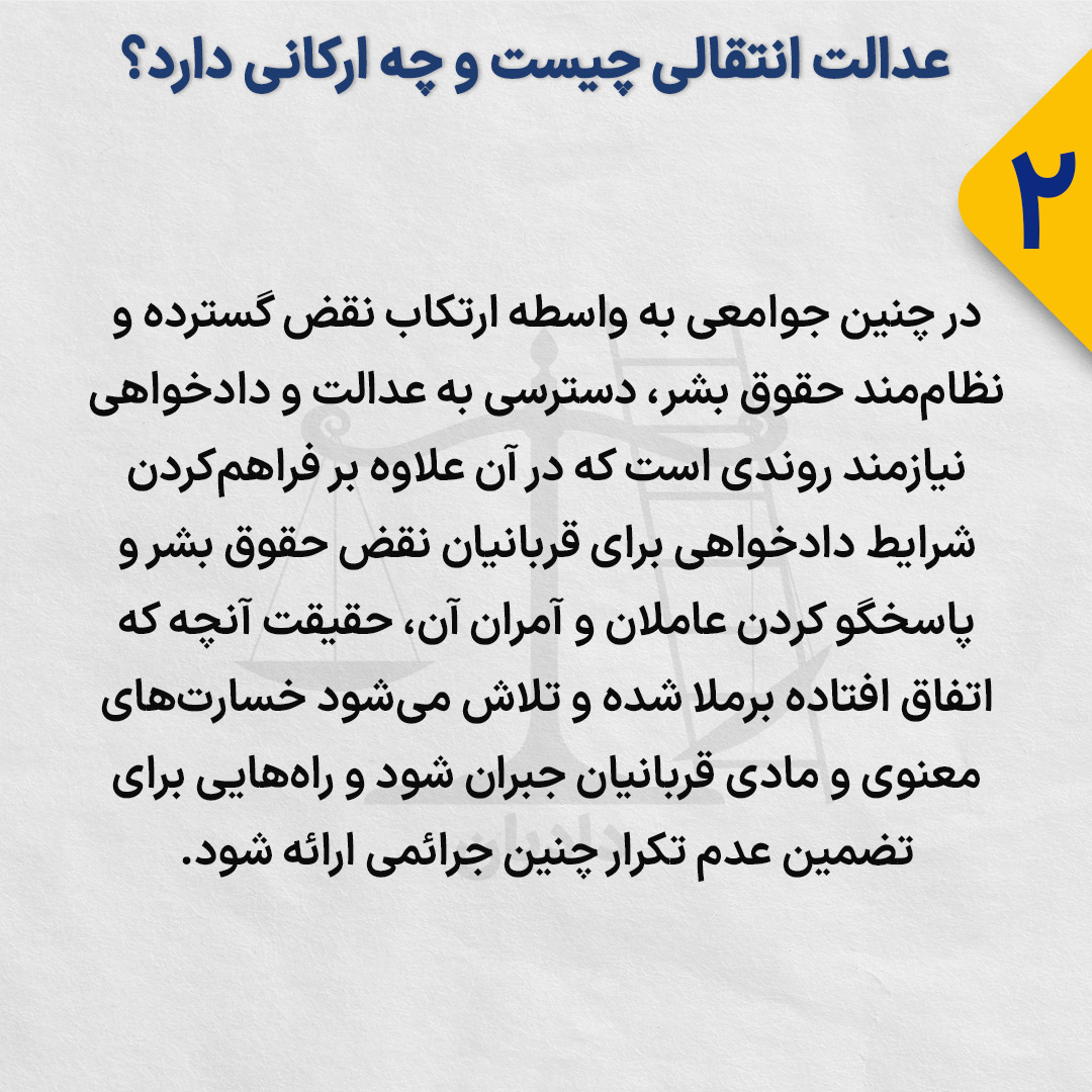 در چنین جوامعی به واسطه ارتکاب نقض گسترده و نظاممند حقوق بشر، دسترسی به عدالت و دادخواهی نیازمند روندی است که در آن علاوه بر فراهمکردن شرایط دادخواهی برای قربانیان نقض حقوق بشر و پاسخگو کردن عاملان و آمران آن، حقیقت آنچه که اتفاق افتاده برملا شده و تلاش میشود خسارتهای معنوی و مادی قربانیان جبران شود و راههایی برای تضمین عدم تکرار چنین جرائمی ارائه شود.