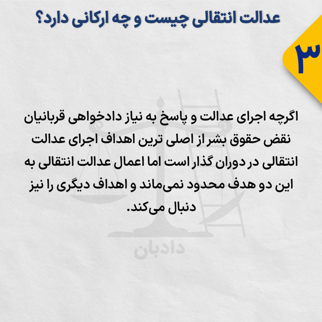 عدالت انتقالی ابزاری است برای پاسخ به نیاز اجرای عدالت و دادخواهی در جوامعی که شاهد وقوع موارد گسترده و فاحش نقض حقوق بشر بودهاند.