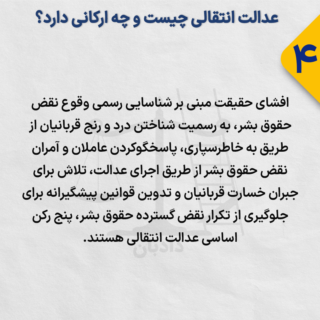 افشای حقیقت مبنی بر شناسایی رسمی وقوع نقض حقوق بشر، به رسمیت شناختن درد و رنج قربانیان از طریق به خاطرسپاری، پاسخگوکردن عاملان و آمران نقض حقوق بشر از طریق اجرای عدالت، تلاش برای جبران خسارت قربانیان و تدوین قوانین پیشگیرانه برای جلوگیری از تکرار نقض گسترده حقوق بشر، پنج رکن اساسی عدالت انتقالی هستند.
