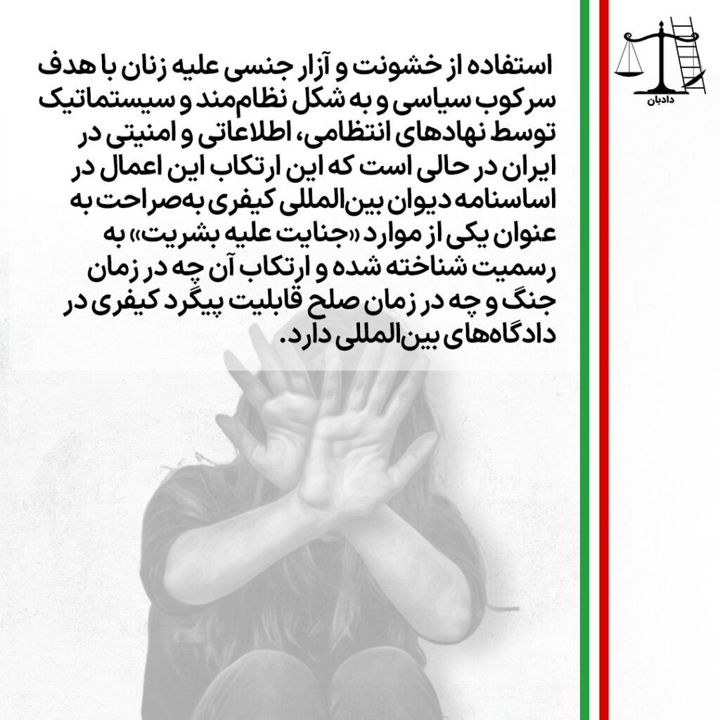 استفاده از خشونت و آزار جنسی علیه زنان با هدف سرکوب سیاسی و به شکل نظاممند و سیستماتیک توسط نهادهای انتظامی، اطلاعاتی و امنیتی در ایران در حالی است که این ارتکاب این اعمال در اساسنامه دیوان بینالمللی کیفری بهصراحت به عنوان یکی از موارد «جنایت علیه بشریت» به رسمیت شناخته شده و ارتکاب آن چه در زمان جنگ و چه در زمان صلح قابلیت پیگرد کیفری در دادگاههای بینالمللی دارد.